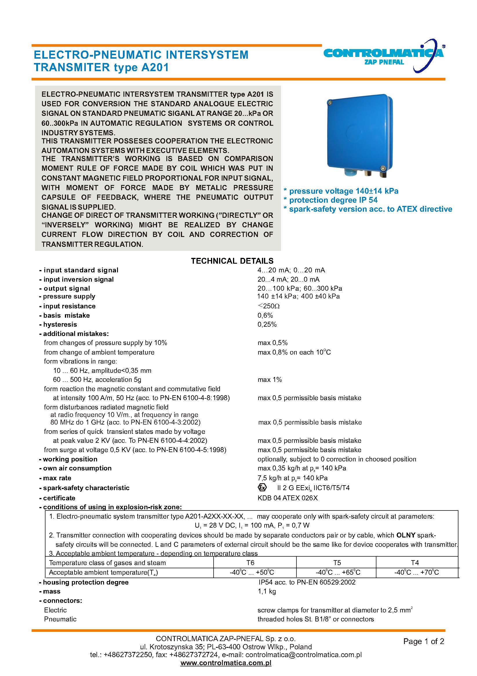 輸入:4..20 毫安;0..20 毫安輸出:0,2..1bar;0,6..3barATEX 證書(shū)